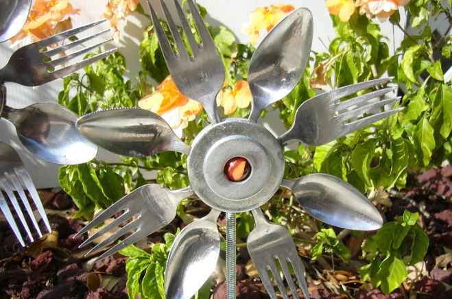If you have spoons and forks with intricate handles or interesting shapes, try turning them into small works of art. Bend them into flowers, butterflies, or other whimsical forms, then glue or weld them together. Display these handmade sculptures among your plants or along garden paths. When the sunlight catches their polished surfaces, your garden will sparkle with unexpected beauty.